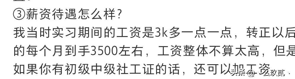 5.③薪资待遇怎么样?我当时实习期间的工资是3k多一点一点,转正以后的每个月到手3500左右,工资整体不算太高,但是如果你有初级中级社工证的话,还可以加工资。