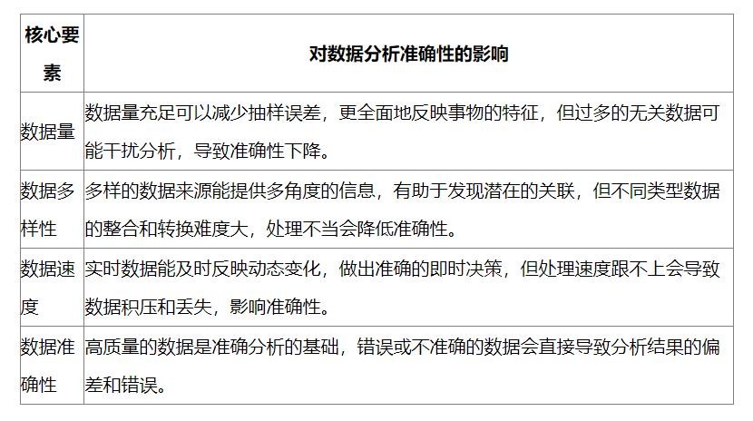 为了更清晰地展示这些核心要素对数据分析准确性的影响,以下是一个简单的表格:
