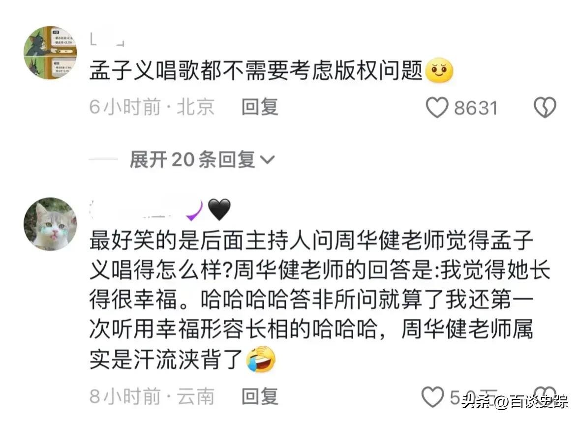 同赵露思一同出糗的还有好姐妹孟子义,五音不全的她不知为何被安排与大哥周华健以及其他几位明星合唱,那效果可见一斑,不过大众对孟姐的包容度还是挺高的,但恶评也是不少。