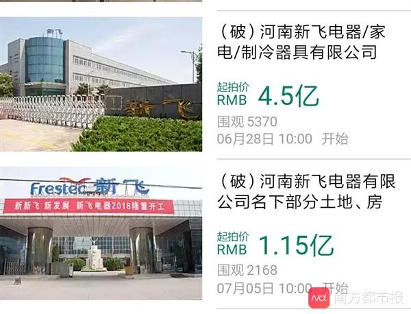 2018年6月,新飞公司以4.5亿元起拍价拍卖公司100%股权,其中包括90项商标、293项专利、4项著作权、4个域名以及所购置软件的使用权(含软件所对应的载体)。另以1.15亿元起拍价拍卖新飞电器位于河南省新乡市的部分土地、房产和建筑物。