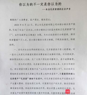 拍卖备受社会各界关注,6月13日,孔府宴酒的运营管理机构孔府宴酒业销售有限公司以《你以为的不一定是你以为的》为题发声回应,称拍卖并未涉及“孔府宴”商标,目前孔府宴酒生产、供应、财务及营销运行良好。