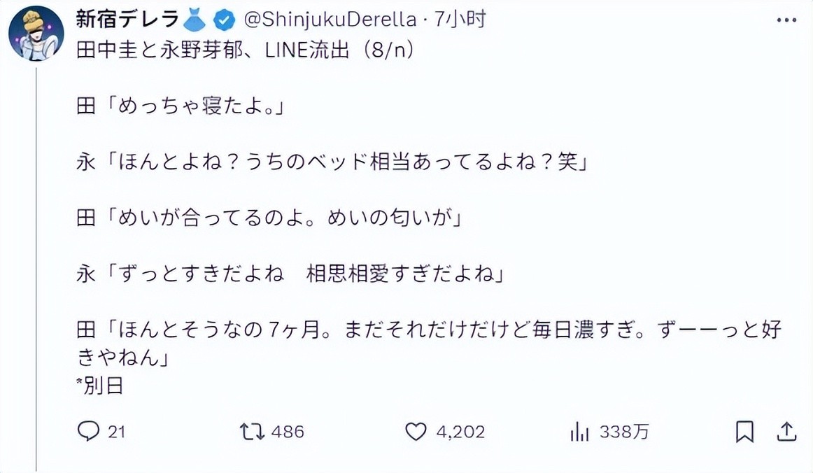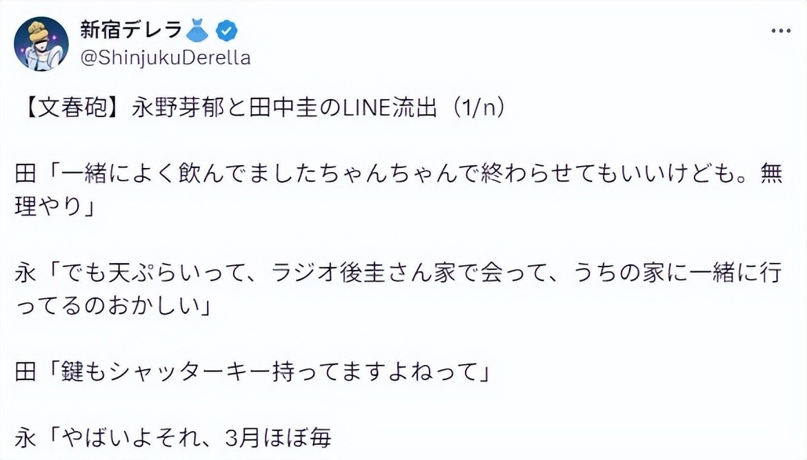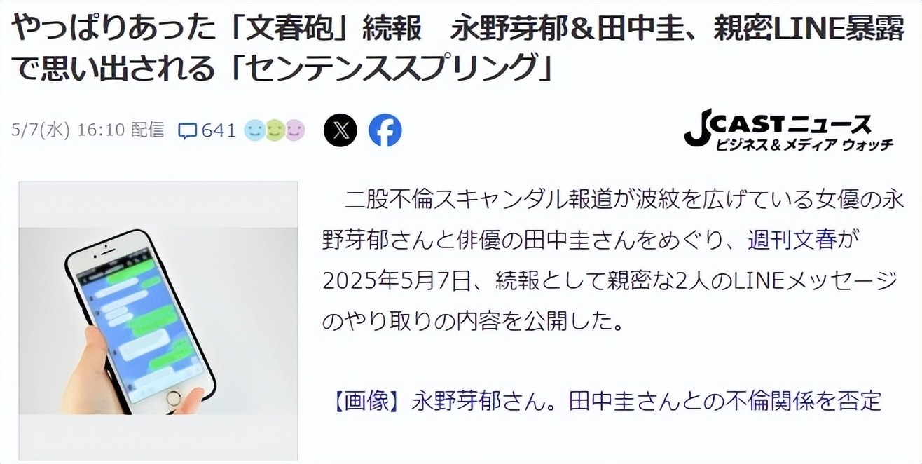 5月7日,《周刊文春》再次曝光永野芽郁与田中圭的亲密照,还公开了他们之间的LINE聊天记录。