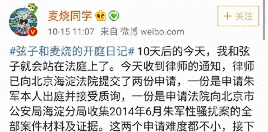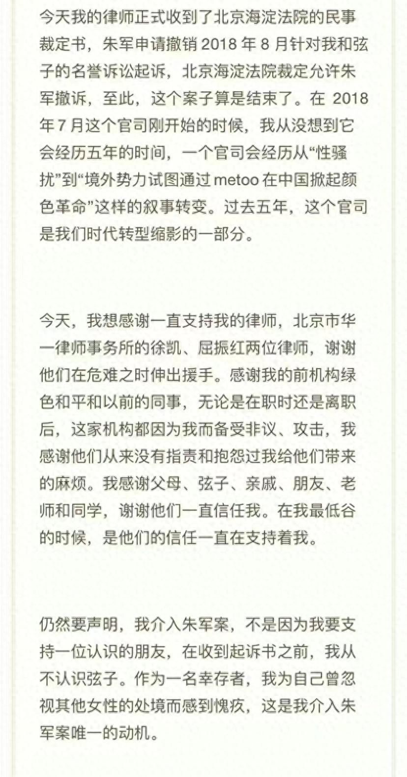 朱军正式放弃了对弦子和她的好友徐超(网名麦烧)的诽谤诉讼。
