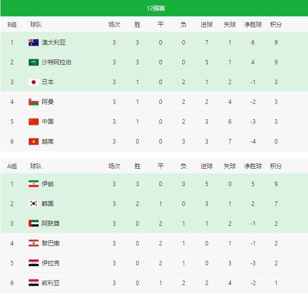 世界杯亚洲区预选赛(12强赛)小组积分