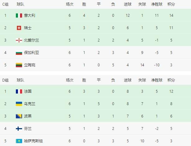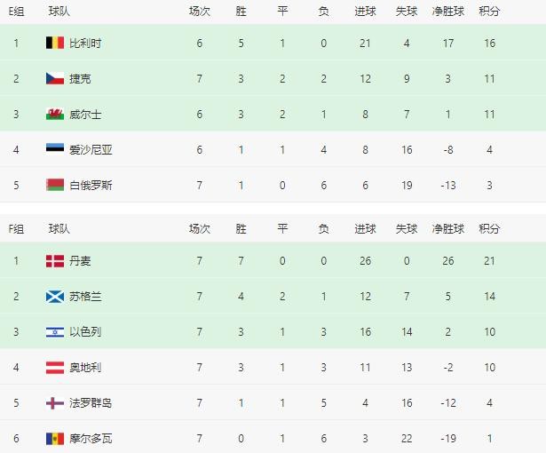 2022世界杯欧洲区、亚洲区预选赛暨12强赛实时积分表(10月12日)