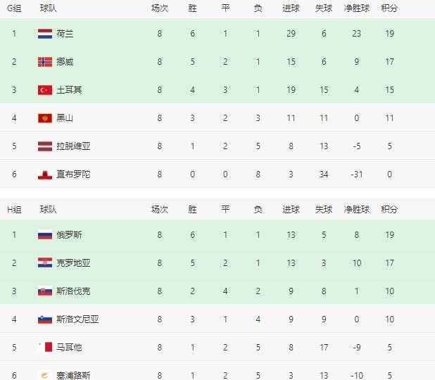 世界杯欧洲区预选赛小组积分