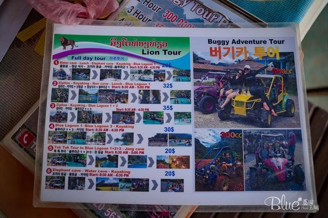 万荣越野车的价格不菲,是按小时计算,一个小时大约是10美元起。还有几条一天玩耍的行程可以选择,价格从20美元到35美元不等,主要是看包含的项目。我们问过这些行程,基本都有探洞的行程,而洞里面是非常原始未开发的,没有灯,必须每人戴个头灯方可完成行程,而且每个行程基本都要坐船,夏天的确是十分凉爽,但我们在冬季前往,河水会很冷,故而我们放弃了,而那个热气球,85美元一位,游客争抢着去坐,所以因为游客太多,排队的人都排到后天去了,那也只有放弃。