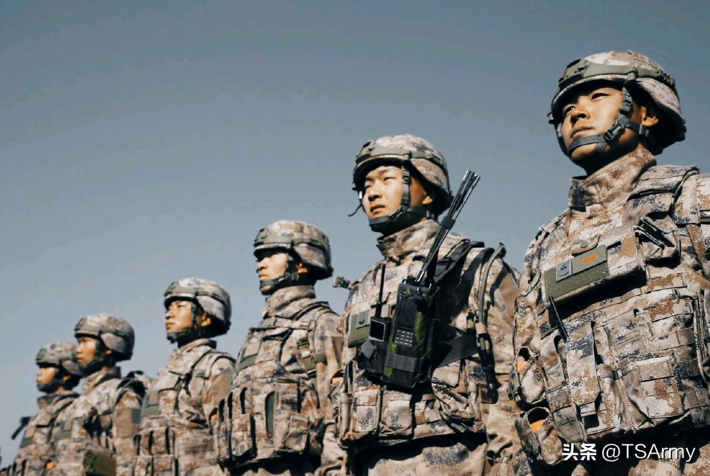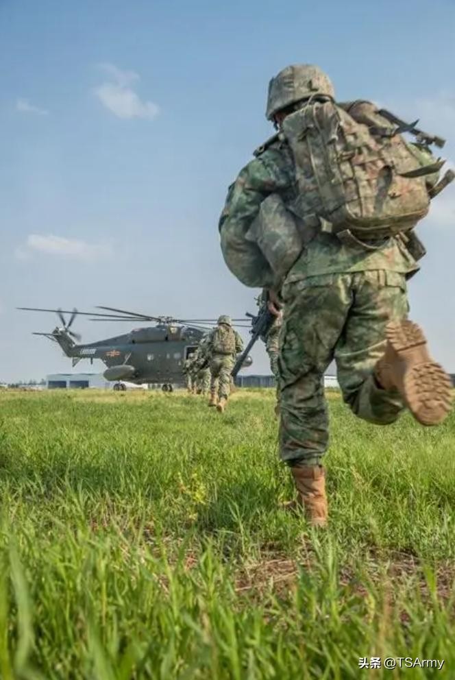 上图是正在进行训练的PLA士兵,身上穿的就是丛林版21式“星空”迷彩作训服,如果要是不看直升机的话,还以为是美军士兵呢。