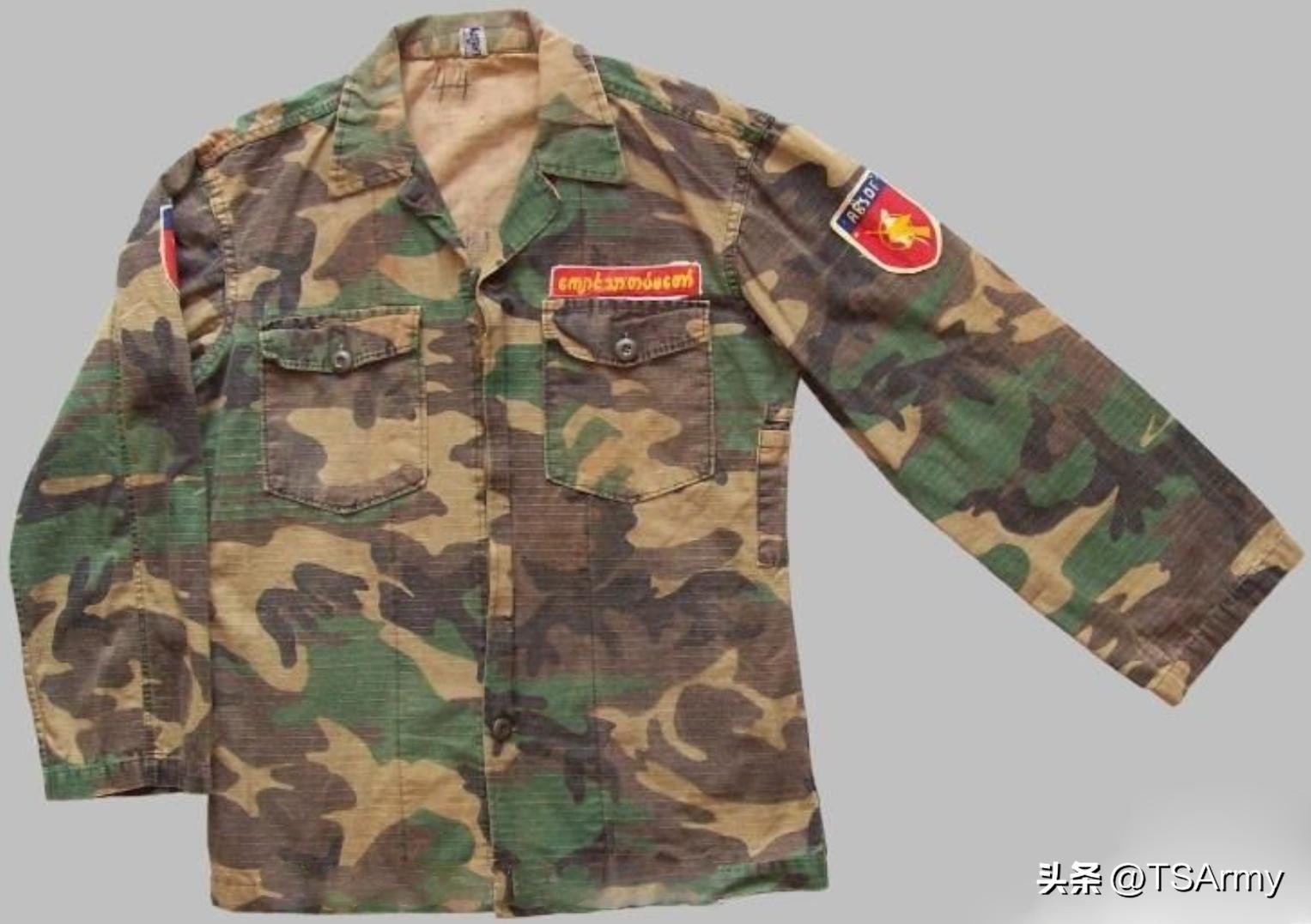 其他的派系阵营咱不说,就说“正牌”的缅甸陆军,他们在2005年才开始陆续配发迷彩作训服,而在那之前一直都是单色的作训服,目前缅甸陆军常用的迷彩服,主要都是在2009年换装的四色林地迷彩服,在设计上结合了邻国多款迷彩服的特点,但整体样式还是有一种八十年代西方老式迷彩服的感觉。