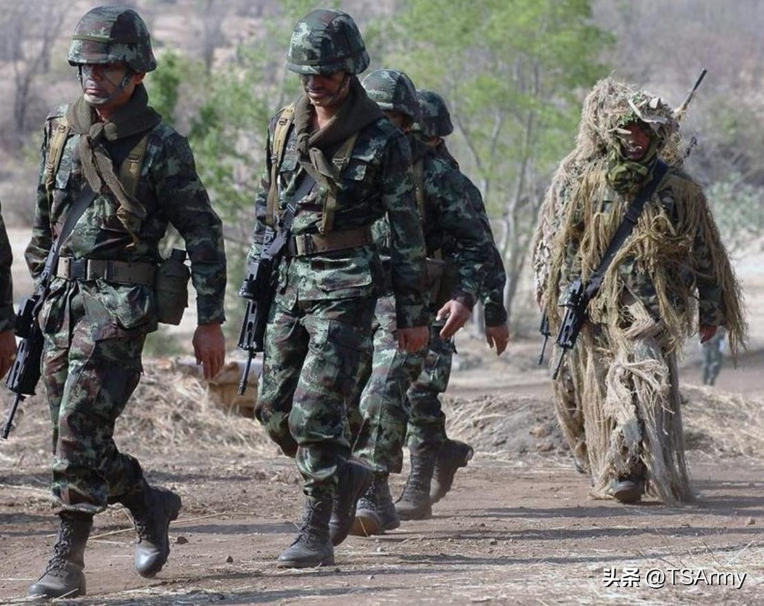 泰国军队在六十年代就是开始给部分军队装备迷彩作训服,不过大多数都是模仿法国的虎纹斑迷彩服,后来又出现条纹迷彩和碎叶迷彩,进入2000年左右也开始研发数码迷彩服,2008年开始装备酷似我国武警之前的林地数码迷彩作训服,现如今这款作训服仍在泰国陆军中服役。