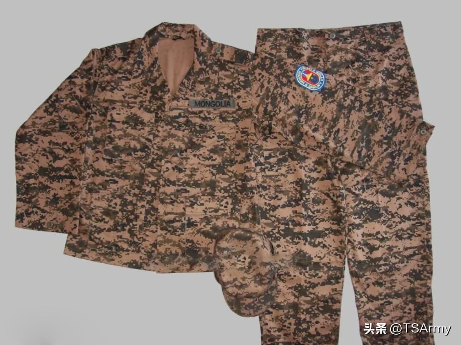 外蒙古军队在九十年代才开始装备迷彩作训服,主要是模仿俄罗斯的三色斑块迷彩,进入二十一世纪一零年代后,外蒙古也开始追赶国际设计数码迷彩服,在2011年三色荒漠数码迷彩服问世,在装备陆军的同时,根据这一版式又衍生出了丛林版、高原版,上图中的是荒漠版。