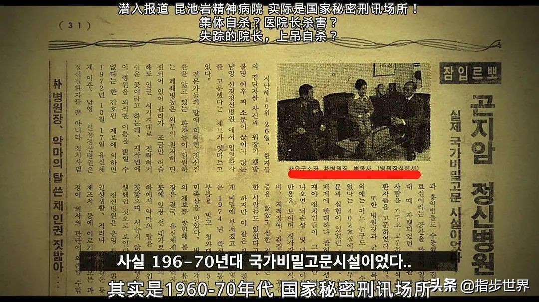 5、展示完伪造的历史视频之后,片中又拿出一张《Sunday首尔》杂志页,该页自称“潜入报道”的昆池岩精神病院在1960-1970年代是韩国的秘密刑xun所,并配了一张三人照片,图说是朴lu军少将、朴院长、崔牧师在院长的办公室里。