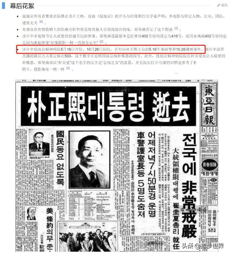 其实这是影射:1961年5月16日,朴z熙在韩国发动zhen变,夺权成功。还有1979年10月26日,精神病院患者集体自杀,院长下落不明、医院关门。实际上,这一天是朴z熙被枪杀身亡的日子。(现实中医院是1992年开门,1996年关门。)