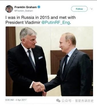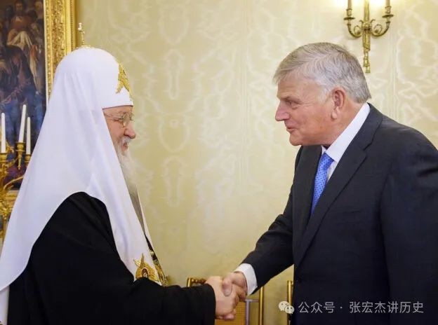 我们知道,川普背后最大的宗教派别是美国的白人福音派。这一派的领袖富兰克林·格雷厄姆( Franklin Graham)是川普的坚定支持者,在川普在去年的竞争中遇刺后,他说:“我相信是上帝让他的头转了过去,救了他的命。”他同样也是普京的坚定支持者,他曾在 2015 年前往俄罗斯与普京会面,他公开赞扬普京维护基督教传统价值观的做法,批评奥巴马政府“违背了上帝的教导”。 [17]