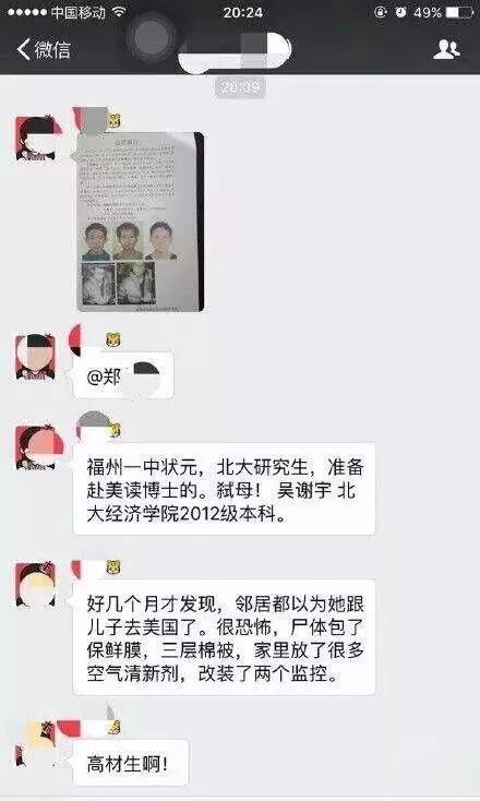 新京报此前报道,2016年3月3日,福州警方发布了一则悬赏通告。通告称,2月14日情人节,警方发现一名女子谢天琴死在福州一所中学教职工宿舍内,其22岁儿子吴谢宇有重大作案嫌疑,警方悬赏万元缉捕。新京报记者获悉,犯罪嫌疑人吴谢宇就读于北大,作案后封死了住处,将尸体用塑料布层层包裹,还放入了活性炭吸臭。弑母后,还以母亲名义贷款。