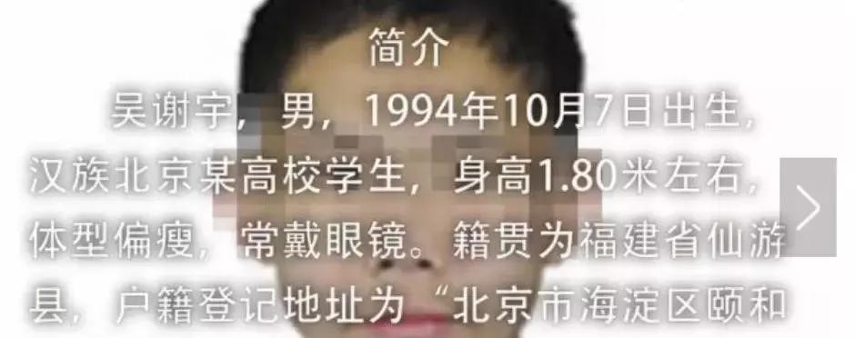 嫌疑人:吴谢宇。其22岁儿子吴谢宇有重大作案嫌疑,警方悬赏万元缉捕