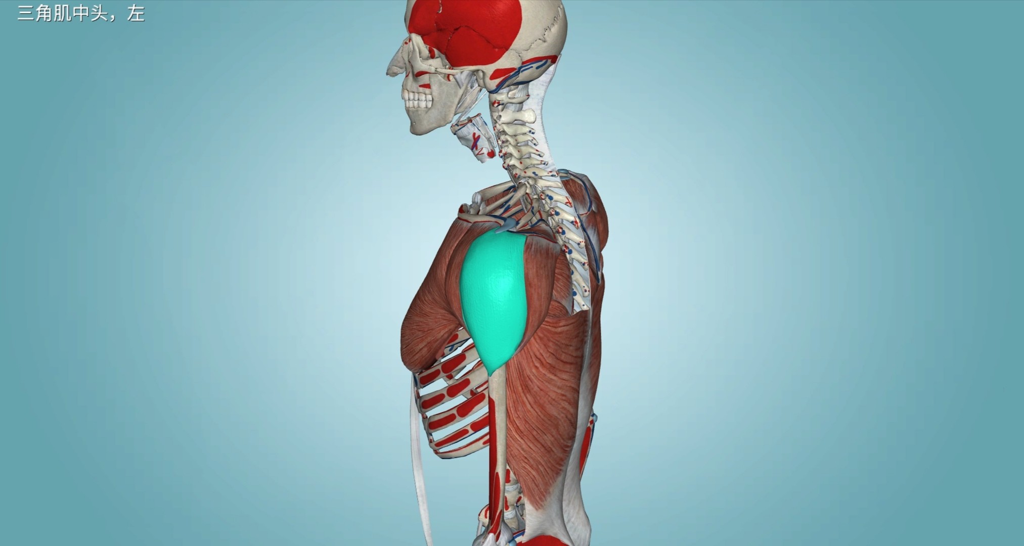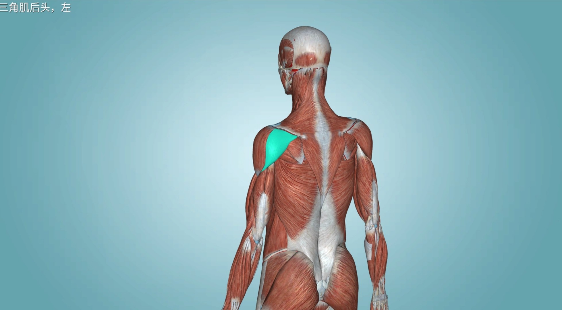 位于肩部皮下,呈三角形,分前、中、后三部,从前、外、后三个方向包裹肩关节,前部和后部的肌束为半羽肌,中部肌束为多羽 肌。肩部的膨隆外形即由该肌形成。