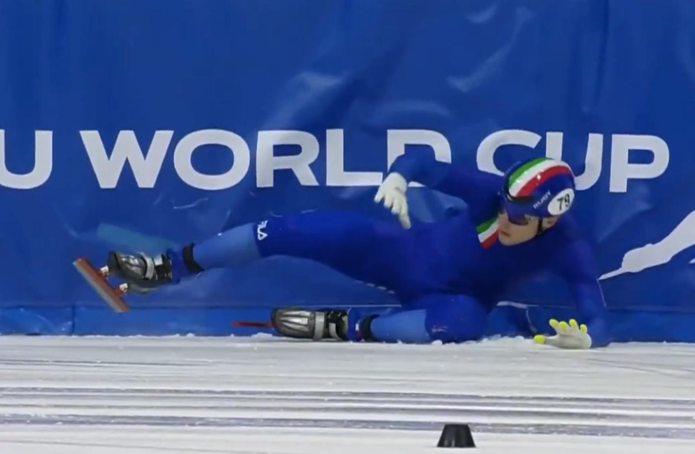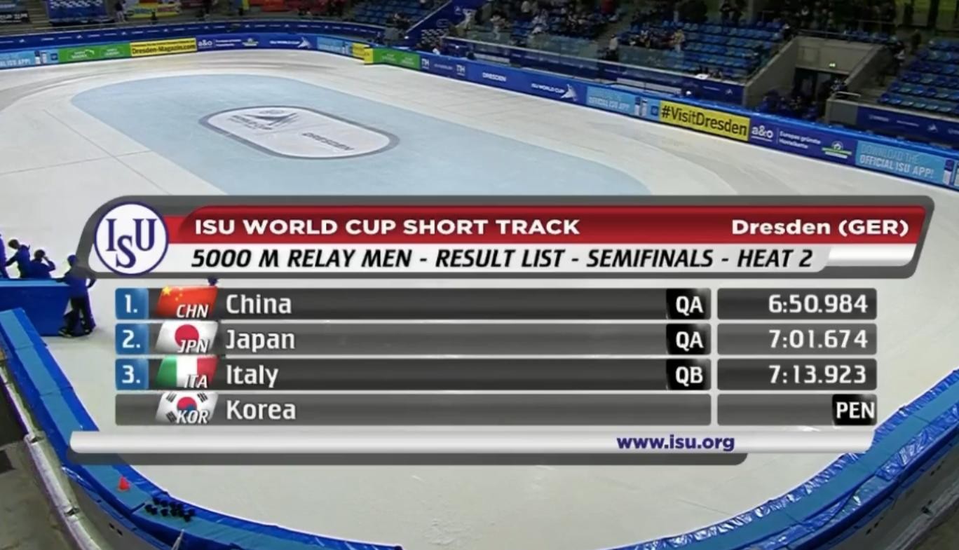 中国队参赛选手是林孝埈、李文龙、刘冠逸、宋嘉华,最终,韩国队第一个撞线,韩国观众在场边十分开心和激动。但此役出现了摔倒情况,裁判事后看回放,发现韩国队队员明显推人,推倒了意大利队队员,导致后者摔倒。