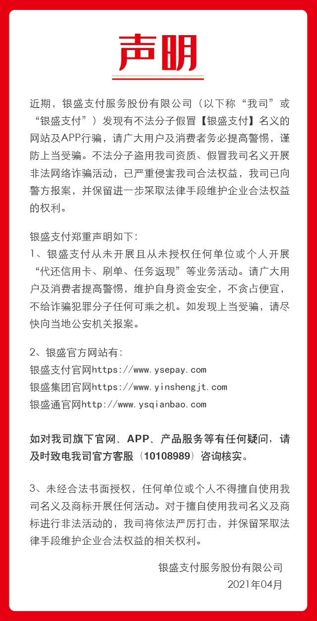 近日银盛支付服务股份有限公司(以下称“我司”或”银盛支付”)发现有不法分子利用假冒【银盛支付】名义的网站及APP行骗,请广大用户及消费者务必提高警惕,谨防上当受骗。不法分子盗用我司资质、假冒我司名义开展非法网络诈骗活动,已严重侵害我司合法权益,我司已向警方报案,并保留进一步采取法律手段维护企业合法权益的权利。