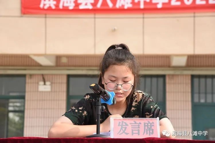 新生代表吴悦同学发言。她代表全体高一新生郑重承诺:端正态度,遵守纪律,服从命令,听从指挥,克服惰性,磨砺意志,珍惜短暂而充实的军训生活。