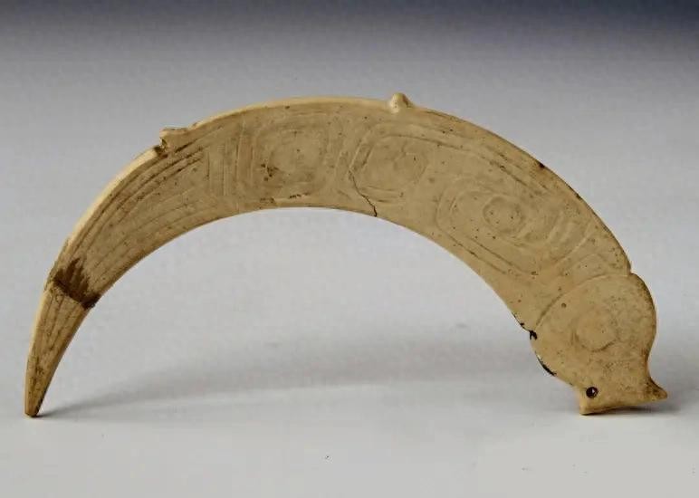 觽,读作(xī),一种造型,其首如龙而尾尖,有扁身和圆身两种,扁身造型如半玉璧,圆身造型如象牙,为祭祀和祈福时之礼器,东汉后渐渐消失。