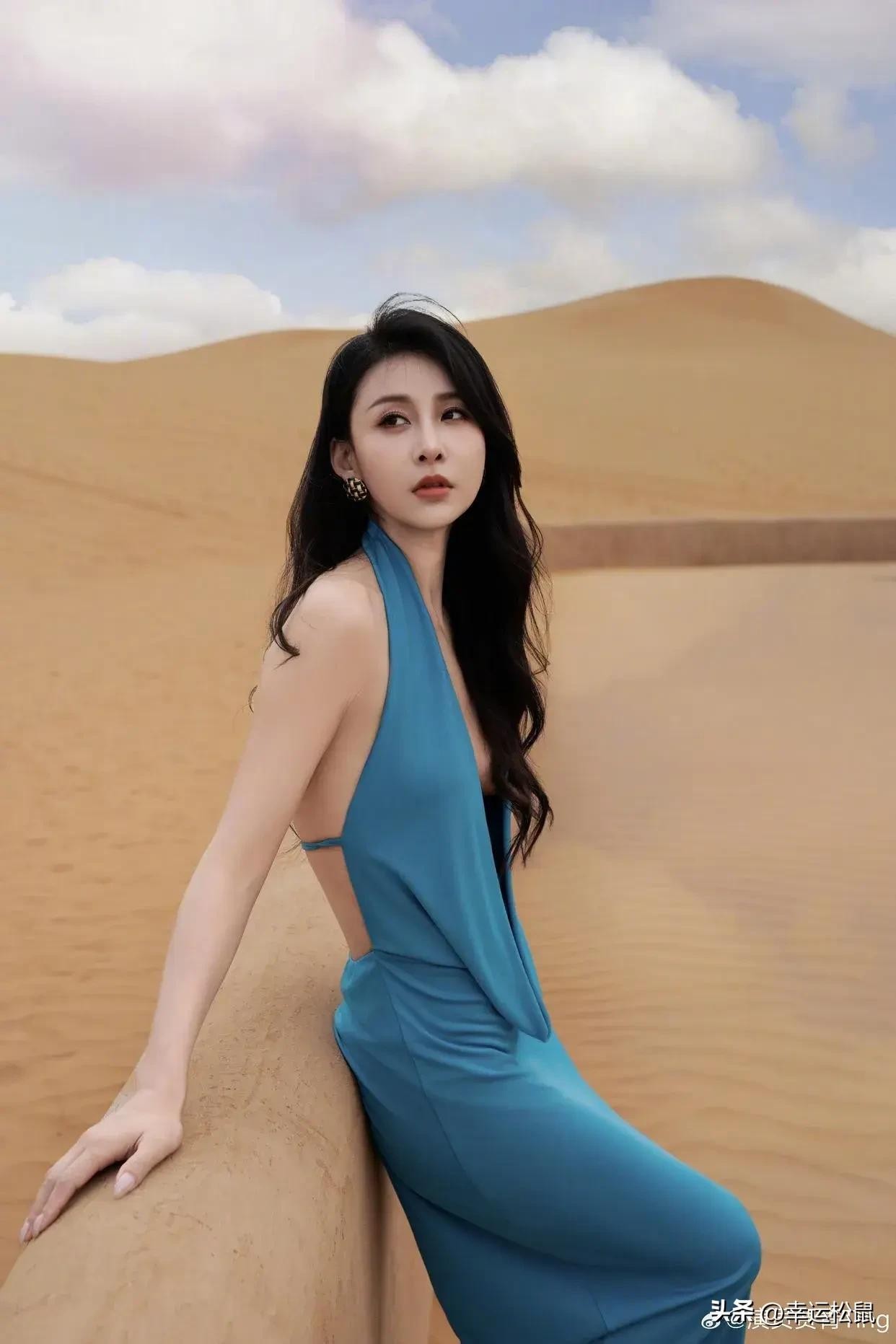 贾青可真敢穿呀!晒沙漠写真,穿蓝色长裙,深V到腰际
