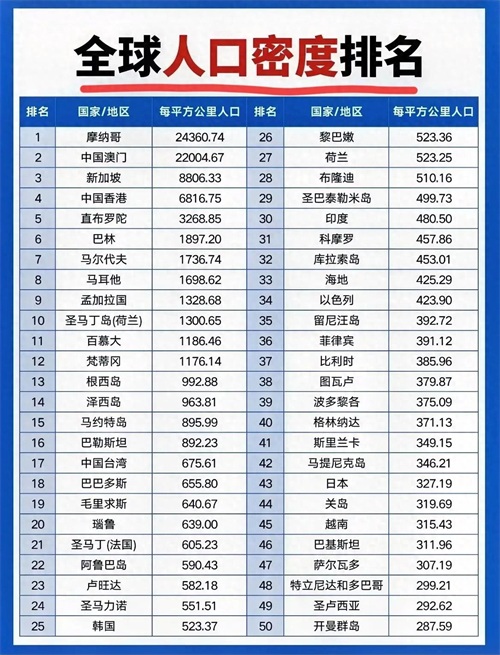 终于有人把“全球人口密度排名”,整理出来了,看完涨知识了。