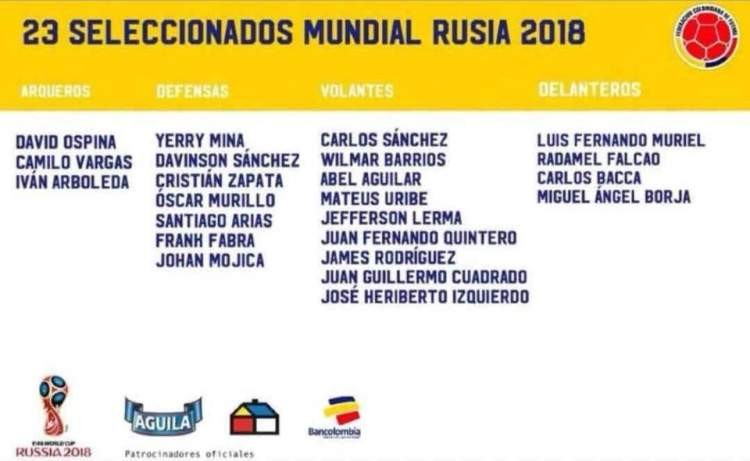 哥伦比亚媒体曝光该国世界杯23人名单 莫雷诺不在阵中!
