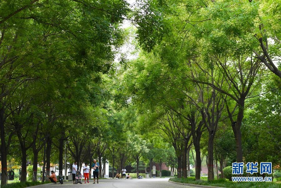 7月10日,市民在日月湖景区内休闲。 日月湖景区位于河南省商丘市,是商丘新区(商丘城乡一体化示范区)水系工程的一部分,承担着灌溉补源、生态观光的功能。景区免费向公众开放,成为夏日里市民休闲的好去处。 新华社记者 郝源 摄
