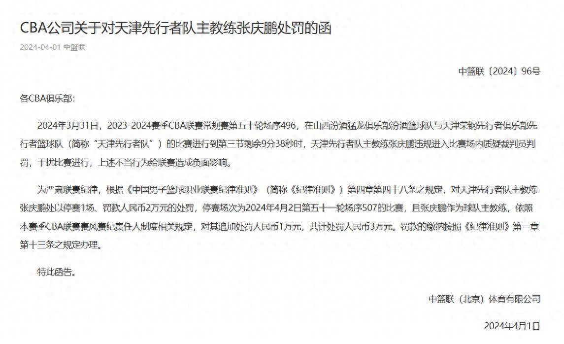 北京时间4月1日,CBA官方发布公告,对天津男篮主教练张庆鹏处以停赛1场和罚款人民币3万元的处罚。