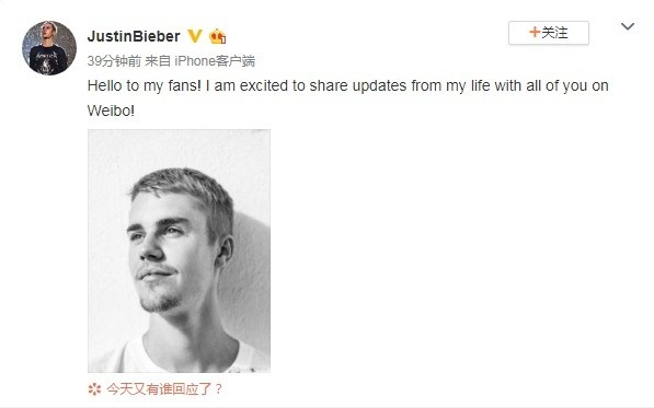 1905电影网讯7月19日,贾斯汀·比伯开通微博后,晒出自拍照,并首次发文称:“Hello to my fans! I am excited to share updates from my life with all of you on Weibo! (我的粉丝们,你们好!我很高兴在微博上和你们分享我的生活)”。