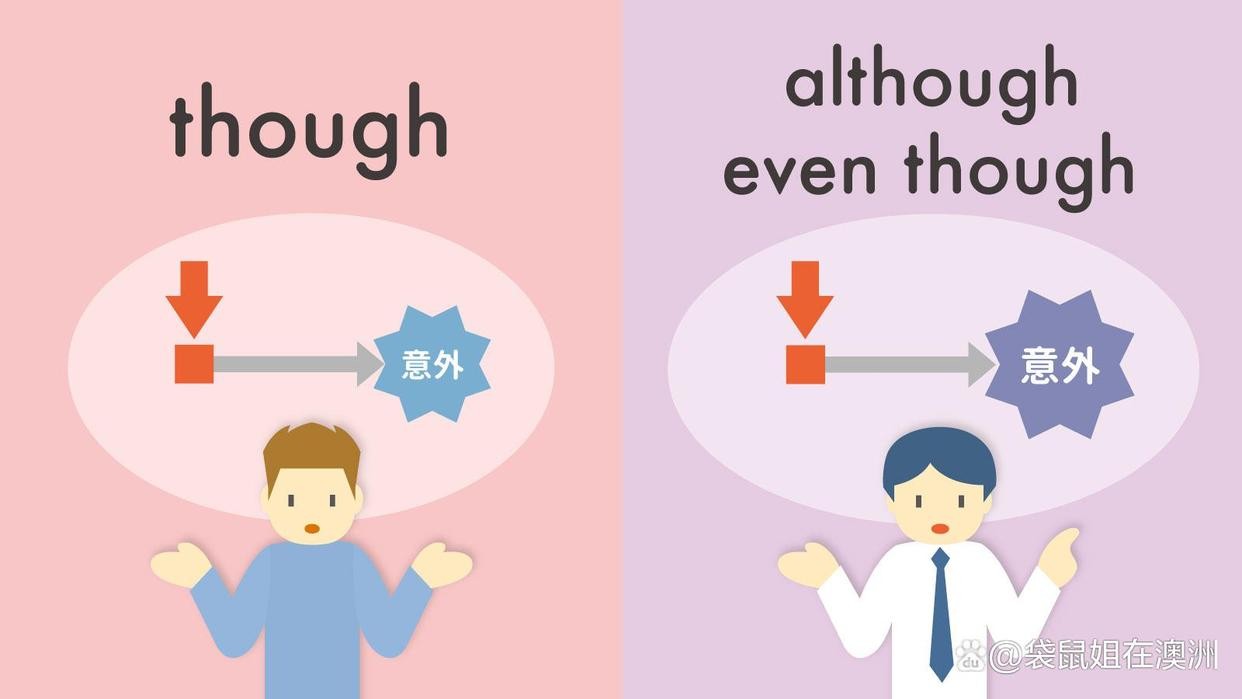 总结: “ Although”与“ Though、 Even though”放在句子的开头或中间时,他们的意思是一样的,都是“尽管”。“ Though”比“ Although”在口语中使用更常见,“ Even though”强调前后两个事物的对比。只有“ Though”可以使用在句子结尾,相当于“However”。