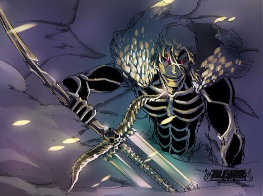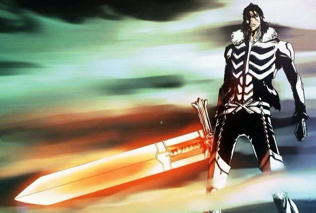 卍解:脸上出现斜向的十字型面纹,头发变白,眼白变黑,身上的黑白护甲变得更加紧实但露出腰部,衣领和腰部以下的护甲缀著长而蓬松的毛。双手剑的剑锷变成长而弯曲的成对螺纹牛角,金色支架的顶部和底部附着几枚利齿,手持的刀柄前端变成不平整的尖锐形状、后段则是脊椎骨般的模样。