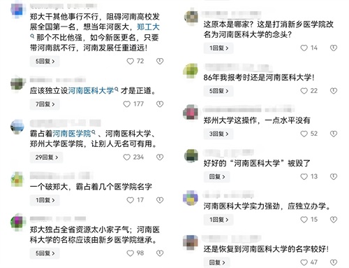 2022年,郑州大学突然宣布将郑州大学医学院改名为“郑州大学河南医学院”。原本只是一件无关痛痒的事情,但河南的网友却对此议论纷纷。其中不乏对这次改名目的的讨论,而且大部分都是负面的议论 ,甚至还有不少人为新乡医学院打抱不平,认为就应该由新乡医学院继承了河南医科大学的名字。