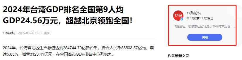 17路论坛:2024年台湾GDP排名全国第9人均GDP24.56万元,超越北京领跑全国!