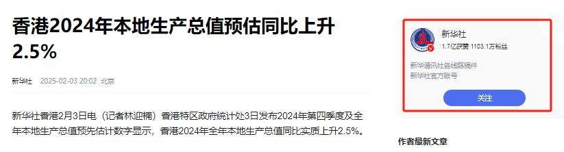 新华社:香港2024年本地生产总值预估同比上升2.5%