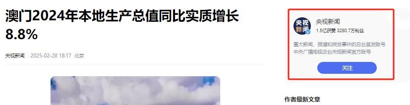 央视新闻:澳门2024年本地生产总值同比实质增长8.8%