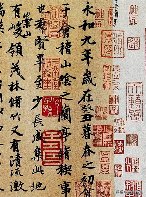 右军将之传给子孙,直至七代孙智永,遗付给辩才,后来被唐太宗「骗」入内廷,唐太宗对他的字着迷不已,曾命搨书人赵模等各搨数本赐给王、臣、真迹则陪他殉葬在昭陵了。武后时,韫桓掘发,真迹又复出,收入玄宗内府,且刻石置于学士院,称为「定武兰序」,经历宋、金而亡。但此本和今天流传下来的墨本各不相同,很难确定究竟原来是什么样子。