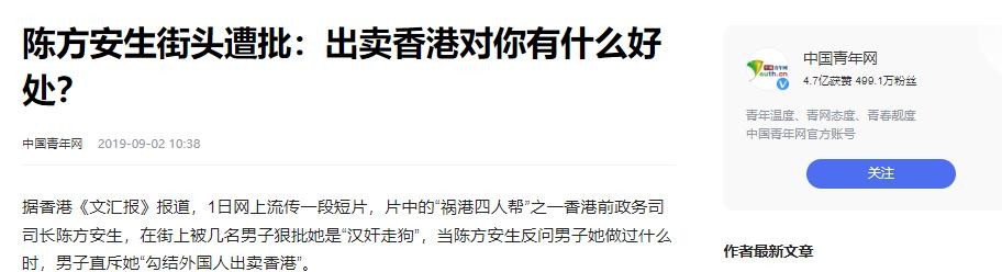 中国青年网2019年9月2日——陈方安生街头遭批:出卖香港对你有什么好处?