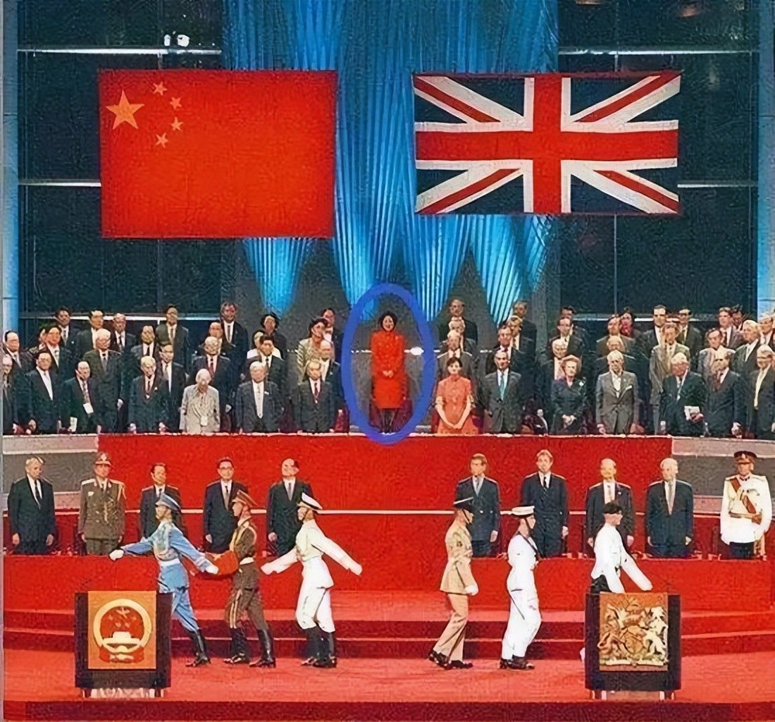 在香港回归那天,她身着红色套装站在中国与英国两面国旗的中间,吸引了全场的关注,用现在的话来说,就是提前抢C位,毕竟她这一身大红色的服装站在人群中间实在太乍眼。