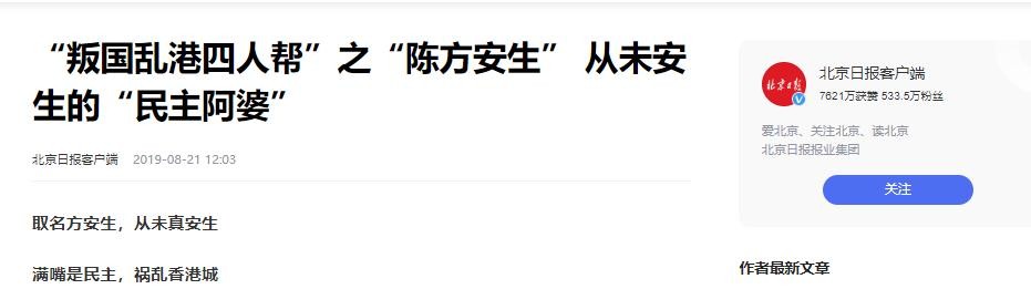 北京日报客户端2019年8月21日——“叛国乱港四人帮”之“陈方安生” 从未安生的“民主阿婆”