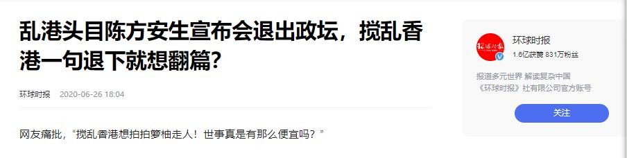 乱港头目陈方安生宣布会退出政坛,搅乱香港一句退下就想翻篇?