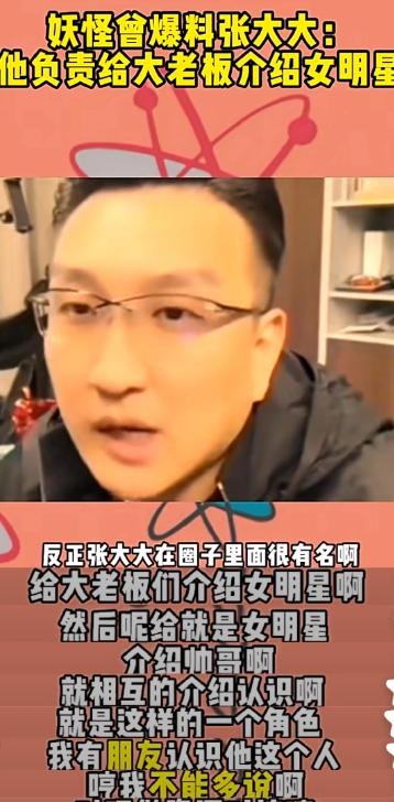 还有博主 “妖怪” 爆料称张大大是中介,主要在大老板和女明星之间牵线搭桥。