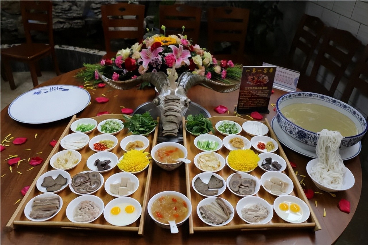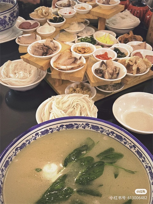 汤用优质牛骨、牛肉熬制,荤配菜有牛肉凉片、鸭肉、鸡肉、鱼片等等,素配菜薄荷、葱、芹菜、韭菜等等,别有一番牛肉、牛汤特有的醇香味。