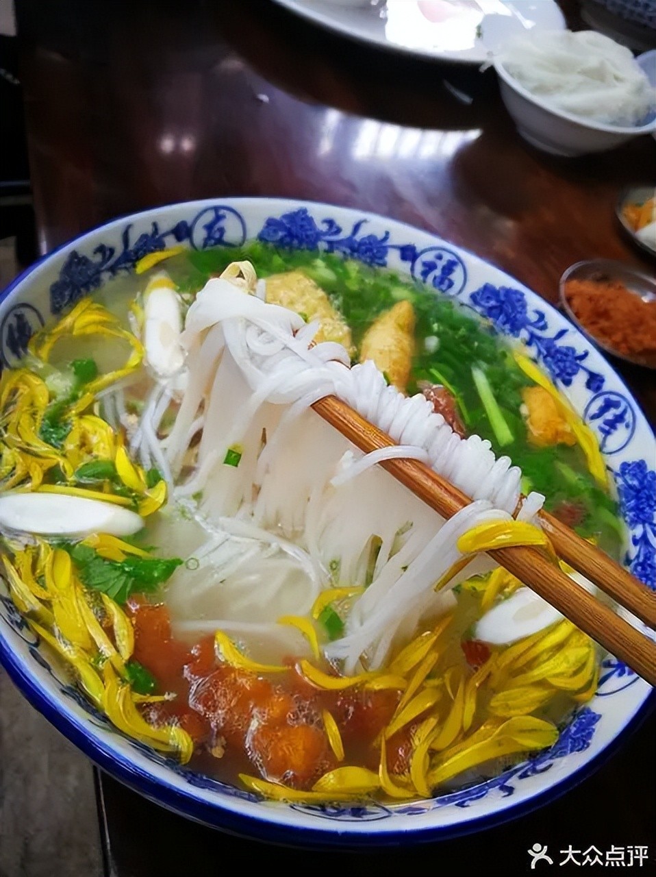 此处说明一下,过桥米线中放菊花,其实首创自蒙自国家级过桥米线传承人王丽珠,后来各家米线店也纷纷效仿,其实上面提到的三家店在配菜中可能也会有菊花。