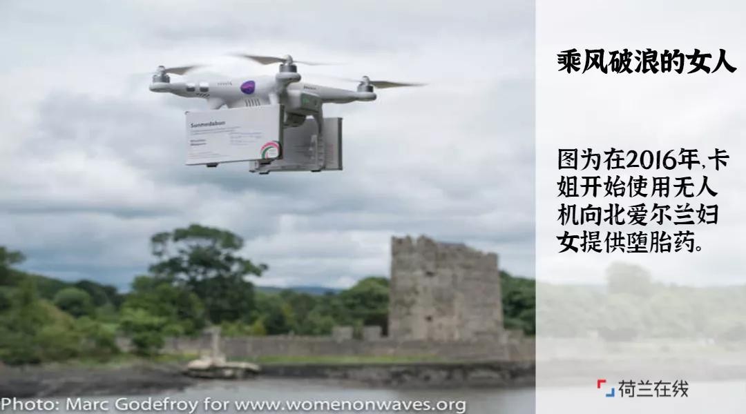 2016年,卡姐又瞄准了欧盟最为保守的地区之一——北爱尔兰,这次是“乘风”,她开始使用无人机向北爱尔兰提供堕胎药。