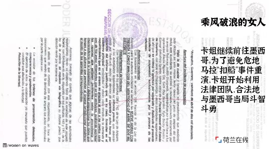 卡姐为所有船员和“乘风破浪的女人”成员进行了合法逗留与住宿申请,以防止被驱逐出国,这一申请最终获得了墨西哥法官的承认批准。