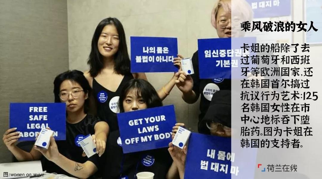 卡姐的船除了去过葡萄牙和西班牙等欧洲国家,还在韩国首尔搞过抗议行为艺术,125 名韩国女性在首尔市中心的地标建筑集合,一起吞下堕胎药。