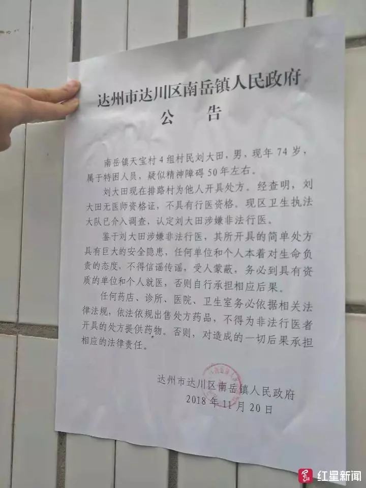 南岳镇党委书记邓泽章介绍,刘大田无证行医的事情出现之后,南岳镇出公告粘贴在场镇和老家,告知众人刘大田无证行医,并用喇叭的形式在街上游走宣传,并和街上的药房打招呼,凡是拿着刘大田单子的人,不得抓药出售。
