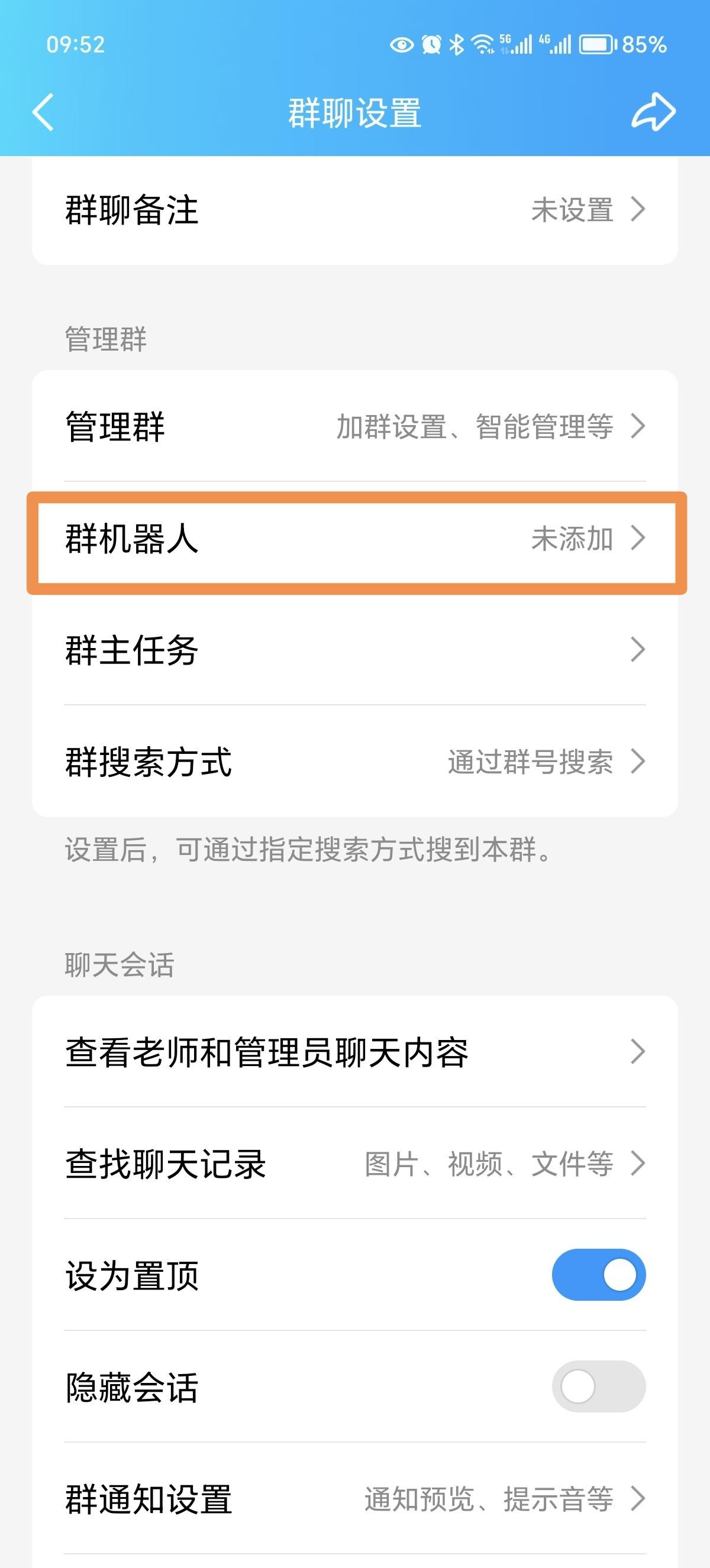 第五步:再次进入“群聊设置”,可以看到Q群管家已经出现在“群机器人”里了。